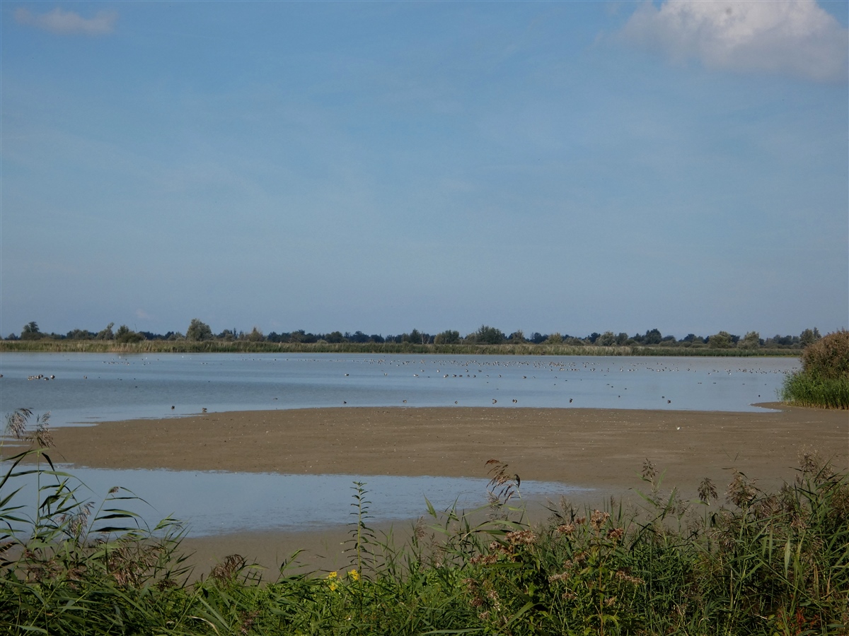 Volgende stop was een strekdam langs de Oostvaardersdijk, vanwaar een pad naar de Hoekplas loopt. Langs dit pad kwam een groepje Baardmannetjes mooi bovenin een wilg zitten, weliswaar gelokt door geluid afgespeeld door enkele fotografen. Daar zijn wij als VWGA niet zo van, maar toch, wel fraai gezien. Door het kijkscherm was er tegenlicht, in de verte wat Kemphanen, Kluten en een enkele Bonte Strandloper. Terug bij de strekdam vlogen in de verte twee Kleine Zilverreigers. Even verderop was het licht vanaf de Knardijk een stuk beter. Gedurende twee vogelstops op de dijk werden we verwend met vele vogels. Boven het Bovenwater foerageerde een 10-tal Zwarte Sterns, soms ook vlakbij. Op een eilandje zat een Koereiger. Op de Hoekplas zelf, die op een dun laagje water na bijna droog lag, enkele Zeearenden, meer dan 1000 Kluten, een 50-tal Grote Zilverreigers, een groep Bonte Strandlopers, Kemphanen, nog een enkele Tureluur en Zwarte Ruiter, een verre Steltkluut en een paar Pontische Meeuwen. Puur genieten.