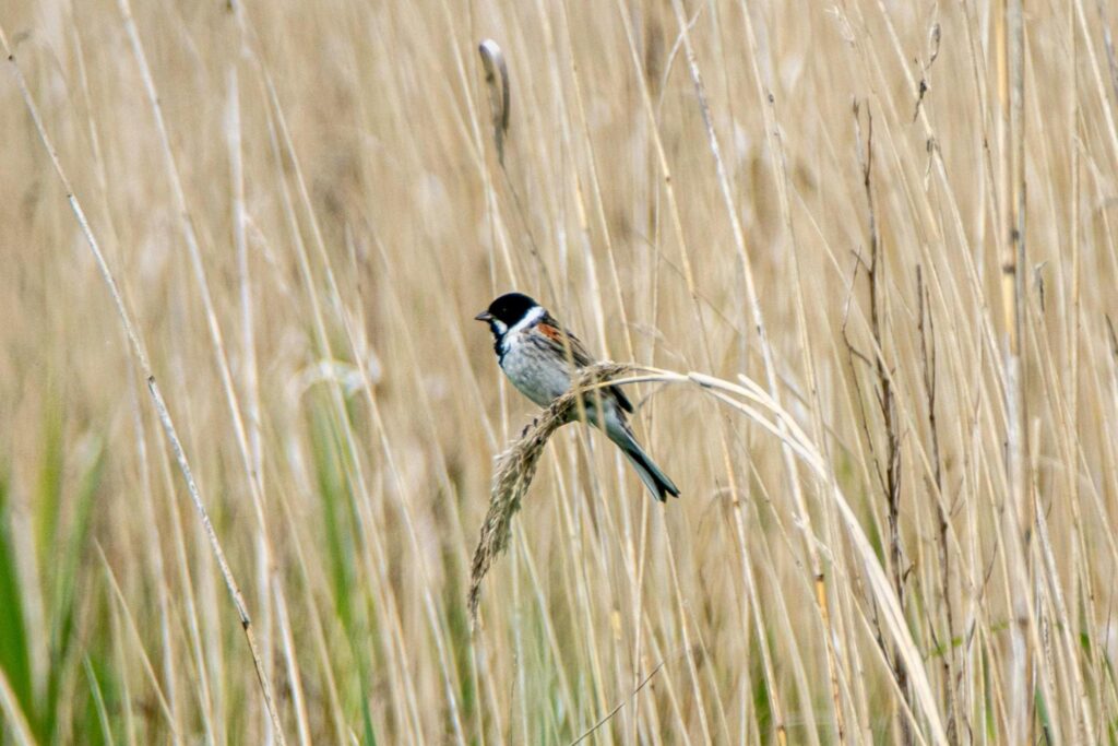 We kozen een avontuurlijke route: klommen over een hoog hek om in een honden-vrij gebied te komen met veel riet, bloemrijk grasland en waterplassen. Het miegelde daar van de rietzangers, rietgorzen en de mooie baardmannetjes. Soms baltsend boven het riet lieten zij een gevarieerd voorjaarsconcert horen, waarvan we genoten.
