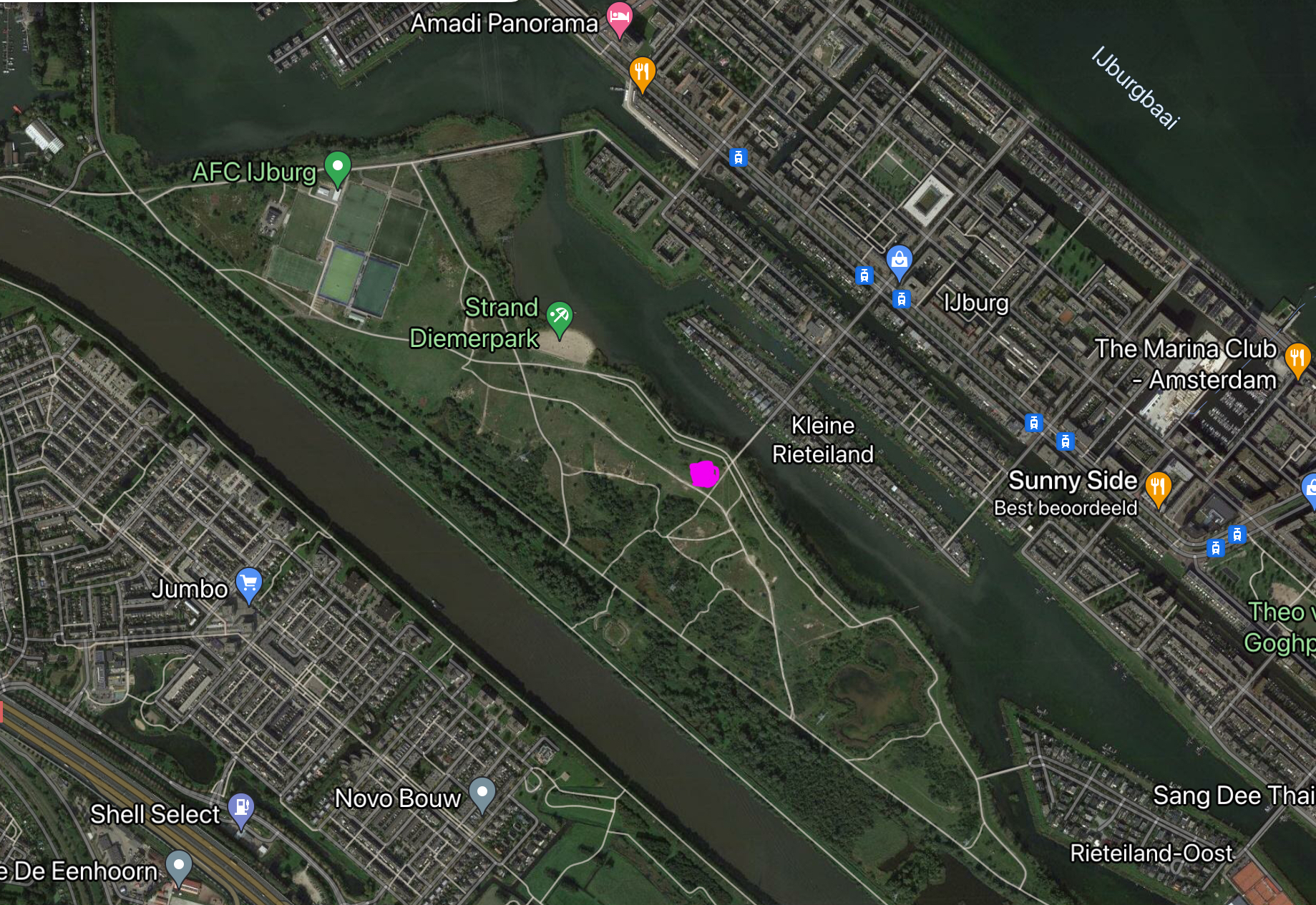 Op de plek van de fuchsiaroze stip op het volgende kaartje van het Diemerpark wordt geteld.