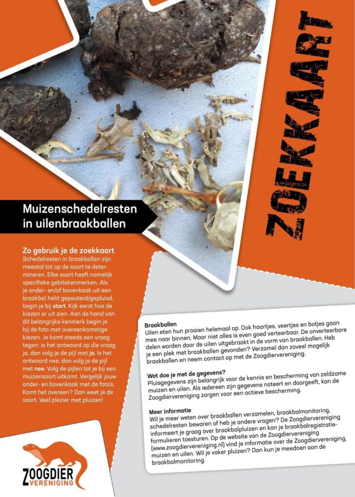 Uilen slokken hun prooien met huid en haar op en braken later de onverteerbare resten uit. In deze braakballen vind je dus: haren of veren, botjes, schedels, snavels, pootjes. Zo kun je zien wat de uil gevangen en opgegeten heeft. Omdat we het leuk vinden om dat te weten gaan we de uilenballen die we verzameld hebben met behulp van prepareernaalden en pincetjes uitpluizen. Als je goed kijkt met een loep en vergelijkt met de zoekkaarten is het zelfs mogelijk om te zien of het bijvoorbeeld een bosmuis, een spitsmuis of een andere soort was. Als je de botjes en schedeltjes op een zwart stuk karton plakt dan kun je ze goed bekijken en bewaren.